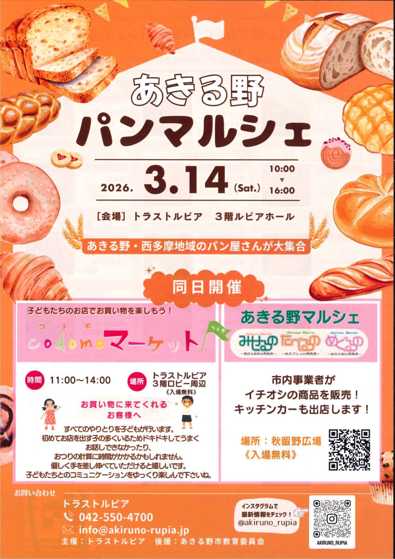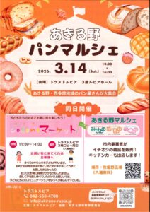あきる野パンマルシェのお知らせ 未分類 2026.03.02 トラストルピア3階ルピアホールにおきまして、あきる野パンマルシェが開催されます。 あきる野・西多摩地域のパン屋さんが大集合! 人気パン屋さんの「自慢のパン」が大集合します。 皆様のお越しを心よりお待ち申し上げます。 パンマルシェ おもて パンマルシェ うら